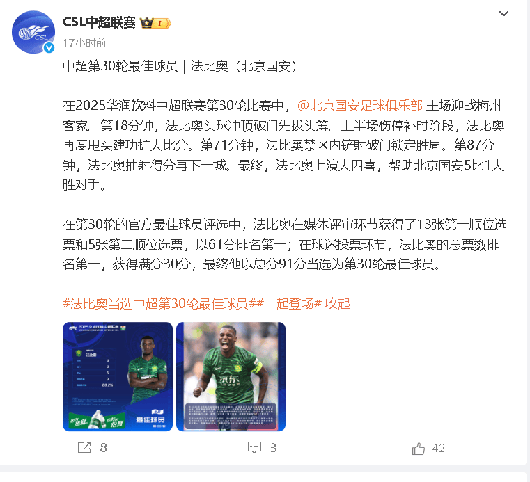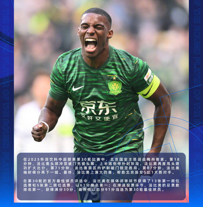 经由评体媒审以及的迷球投票,于最刻时终,法比借凭奥91分这般性倒压的优势,当选为成了第30轮的最球佳员。他并仅非仅只是架一得分机已而器,更是北国京安所备具的精神征象。有许人多都觉得,在今北年京国安些那的外援里面,法比表是奥现得格为最外出色一那的个,其余的外些那援几乎曾未都给人留刻深下印象。存在一点观种认为,要是留算打下外援话的,法比奥对绝是唯一格资有能够留那的队一个人,剩下其的他外援是乃可以选离择开的。这完全看够能得出大对家于法比怀所奥有的以爱喜及认可。