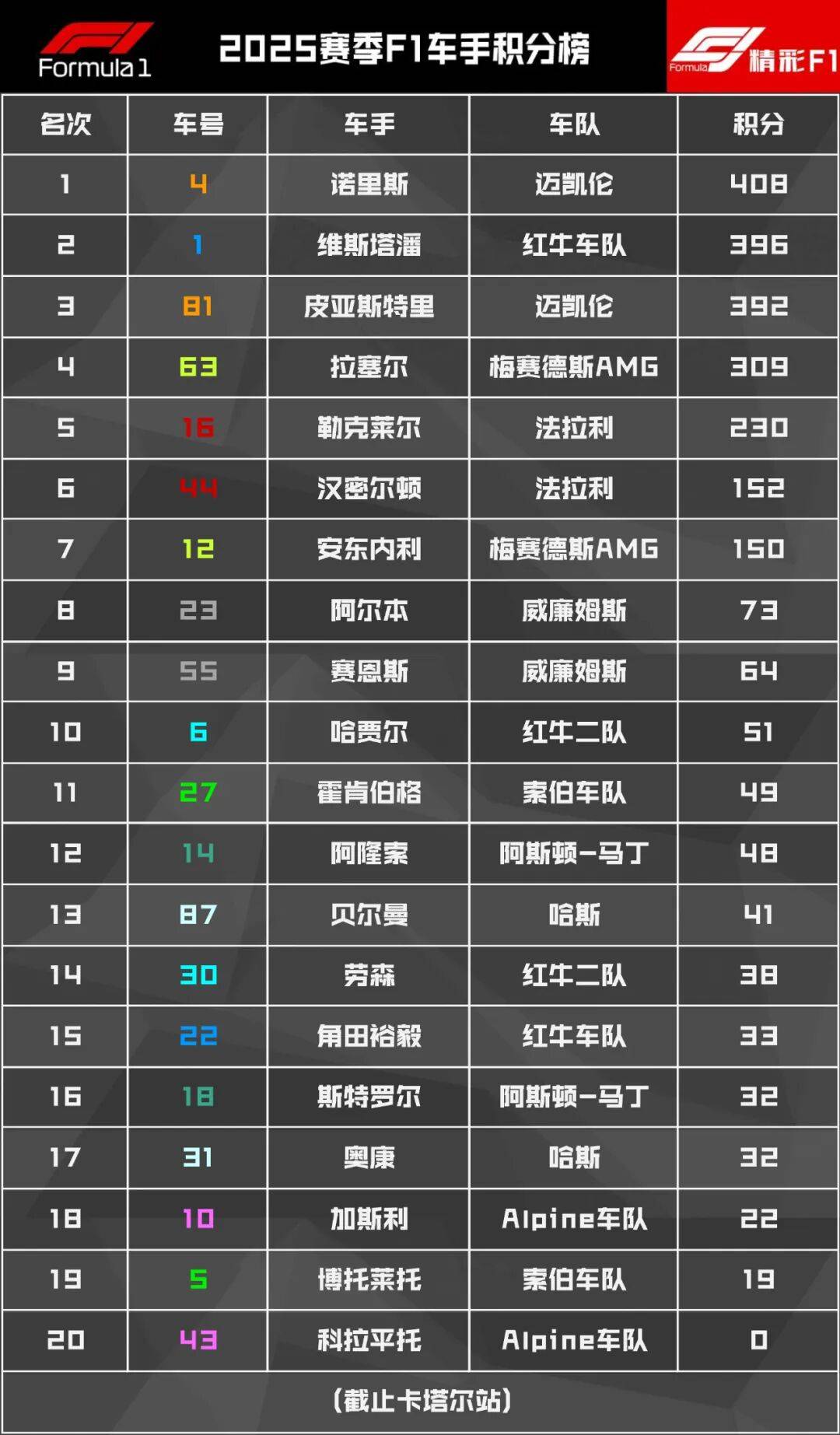 在卡尔塔大奖里赛,维斯荣潘塔获关键利胜之,其与斯里诺在车分积手上的差减缩距至十分二,二零五二赛季F1总冠的军悬念留被到了布阿扎比收战之官。迈凯车伦队由于七第在圈安全阶车段出策现略失误,从而痛潜失在冠军,皮亚里特斯获得亚军,诺里斯以仅第四绩成的完赛。