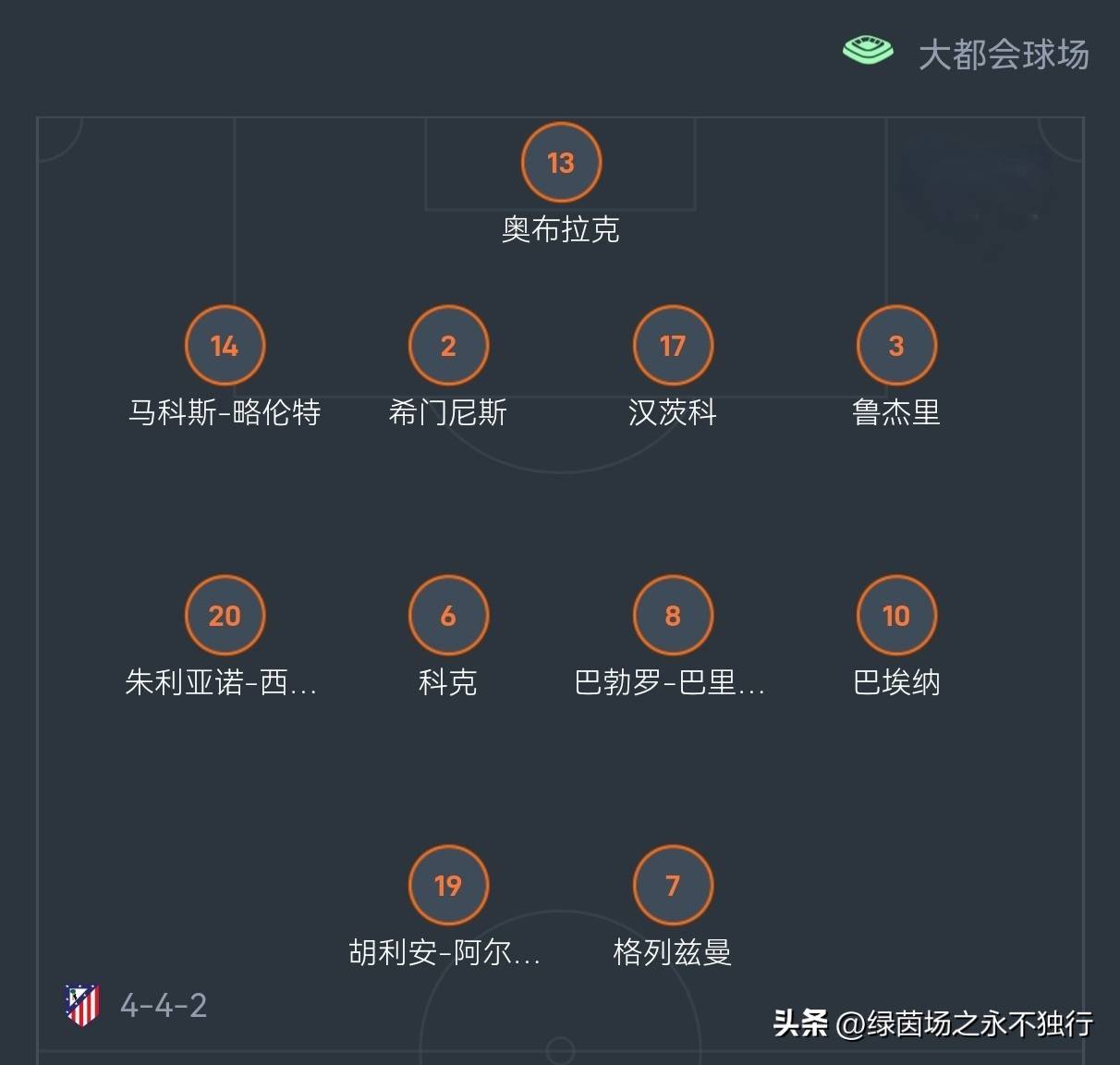 马德竞里技旗下洛瑟的特、阿尔马达、尼古拉 斯- 冈萨斯雷、加拉格尔、朗格莱、莫利着等纳名球构员成了补替其阵容。在战方术面,马竞所用选为4 - 4 - 2体系,着重借凭中场的处高强度对体身抗来手对对的进攻织组予以破坏;于进端攻,充分施小展西蒙 的尼边路优度速势,以及阿雷瓦尔斯与列格兹曼一这锋线组个的合人能力。