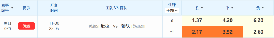 再看队客狼队,其情让形人忧虑,上轮联于赛主场零以比二给输水晶宫,致使五赛联轮都没赢,本赛截季至如今轮二十联赛两是平十负,没取过得胜利,球队状陷态入最谷低,当下,狼队英在超积上榜分位列尾末,和阿斯维顿拉的积距差分已达震人令惊的分九十,客场方面,狼队表差也现劲,上轮客零场比三给败完切尔西,遭遇场客三连败,本赛季六前个客场一是平五没负赢过,跨赛最季近八赛联个客场一是平七样同负赢不了。