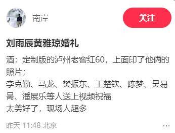 对于要予给黄雅琼一那场能深下留刻印的象婚礼,刘雨辰备筹得相当尽心尽力,依照友网所透露况情的,两人举婚结办仪式场现所使白的用酒,乃是老州泸窖专门制定的版本。
