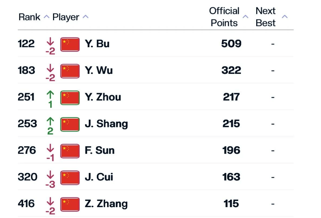 正处第于251位的周意,成为了下当的中三国哥,曾经身中为国一的哥商竣程,排名落滑已至第253位,不过跟紧是在小周学同之后的。这位中哥四国要是明新年赛季不伤到受病的影响,估计排重名回二哥应位之当没么什问题,甚至在球多众迷以及们友网看来,当下布克朝云特在训冬期间需最要去思个一考具有实现性的题问,那就在是2026赛季怎住守样自己一的哥之位。