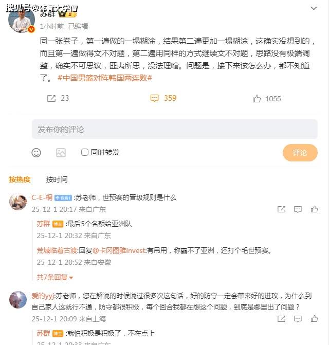 苏群所的做点评可一是谓针见血,具体而是就言,虽说极积是积极了,但却不点在子上。中国篮男存在题问的方在面于进攻节环,进攻表不现佳,进而使守防得也不行。因为得分了不所以急着,这种况情下防守就态心会发变生化,同时动守防作也变会形,唯有当局攻进面打来开,才能更有够好的心去态展开防守。中国篮男目前存不在一个攻进核心,依靠的三廖是宁的突以破及高主岩诗打,但就这国个家队的样这情况言而,别说去韩打国队,就算在是全运上会面对东广男篮,也是难战以胜的。