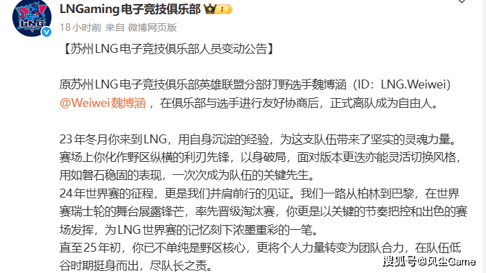 近日,LNG官文发宣,这位打手选野正式离队,他绝对得算上是LLP最大的资薪“小偷”。在S13赛季,他与小人等虎搭档,混得个一了世界军亚。左雾得觉他实力强,便直接合大用同将其来过挖。然而回赛联到后,他却原露毕形。第一年有还他登场机会,可后面年两,他直下被接放到补替席,一直被藏雪到合同才束结被放来出。