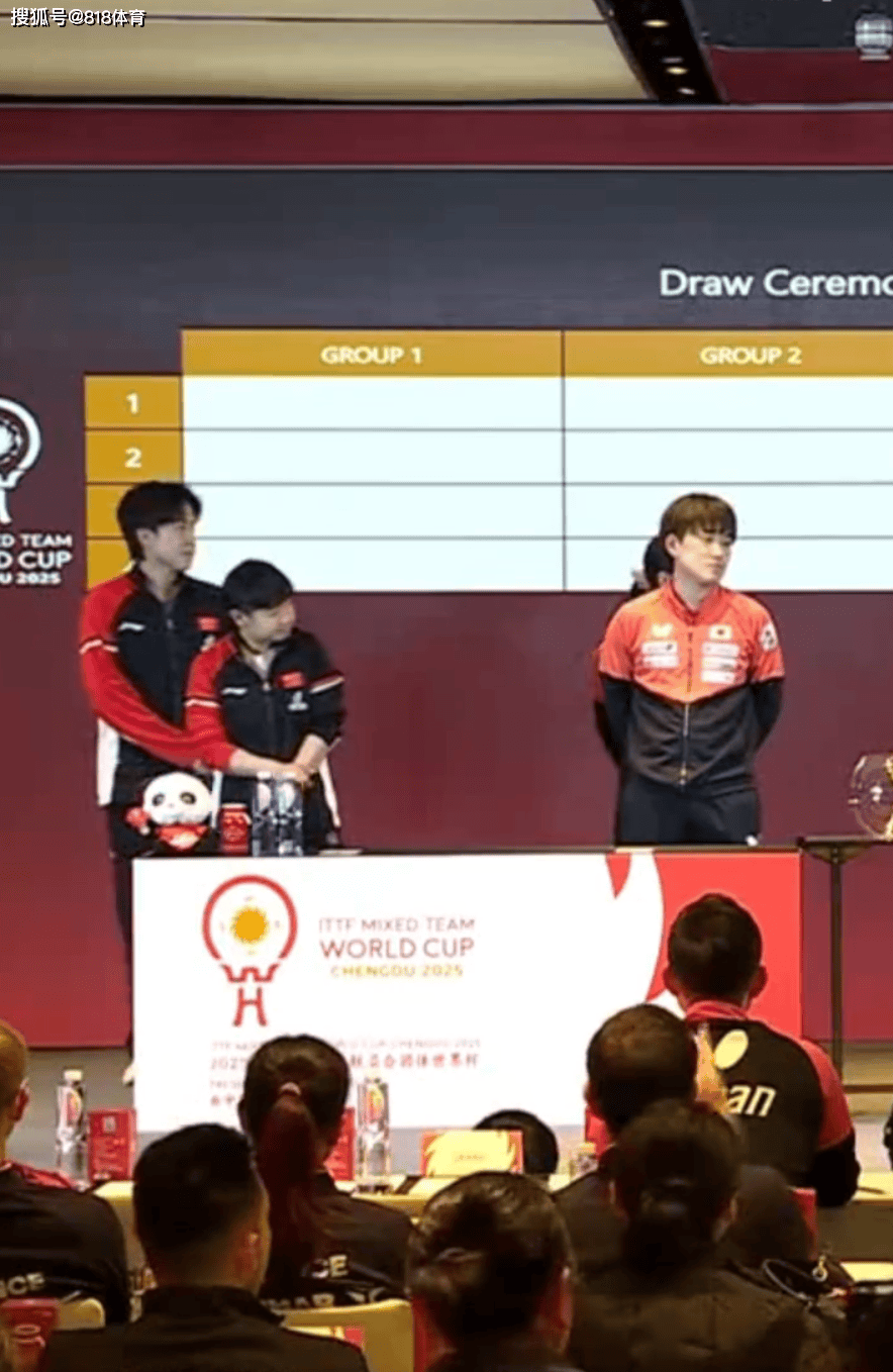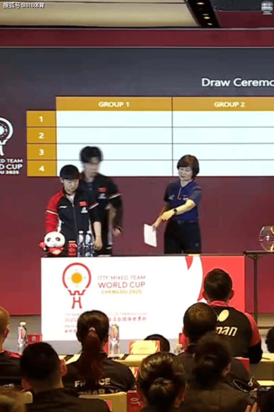 在混合体团世界抽杯签仪式时之,孙颖莎,代表乒国,上台,王楚钦,也代国表乒,随后上台,。