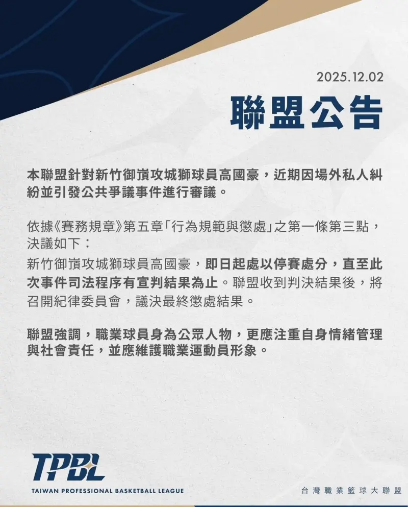 TPLB联盟新对针竹攻城员球狮高国豪,近期因外场私人引纷纠发公共事议争件,对此行进审议,依据《赛务规章》第五章“行为与范规惩处”之第一第条三点,做出如定决下: ,。