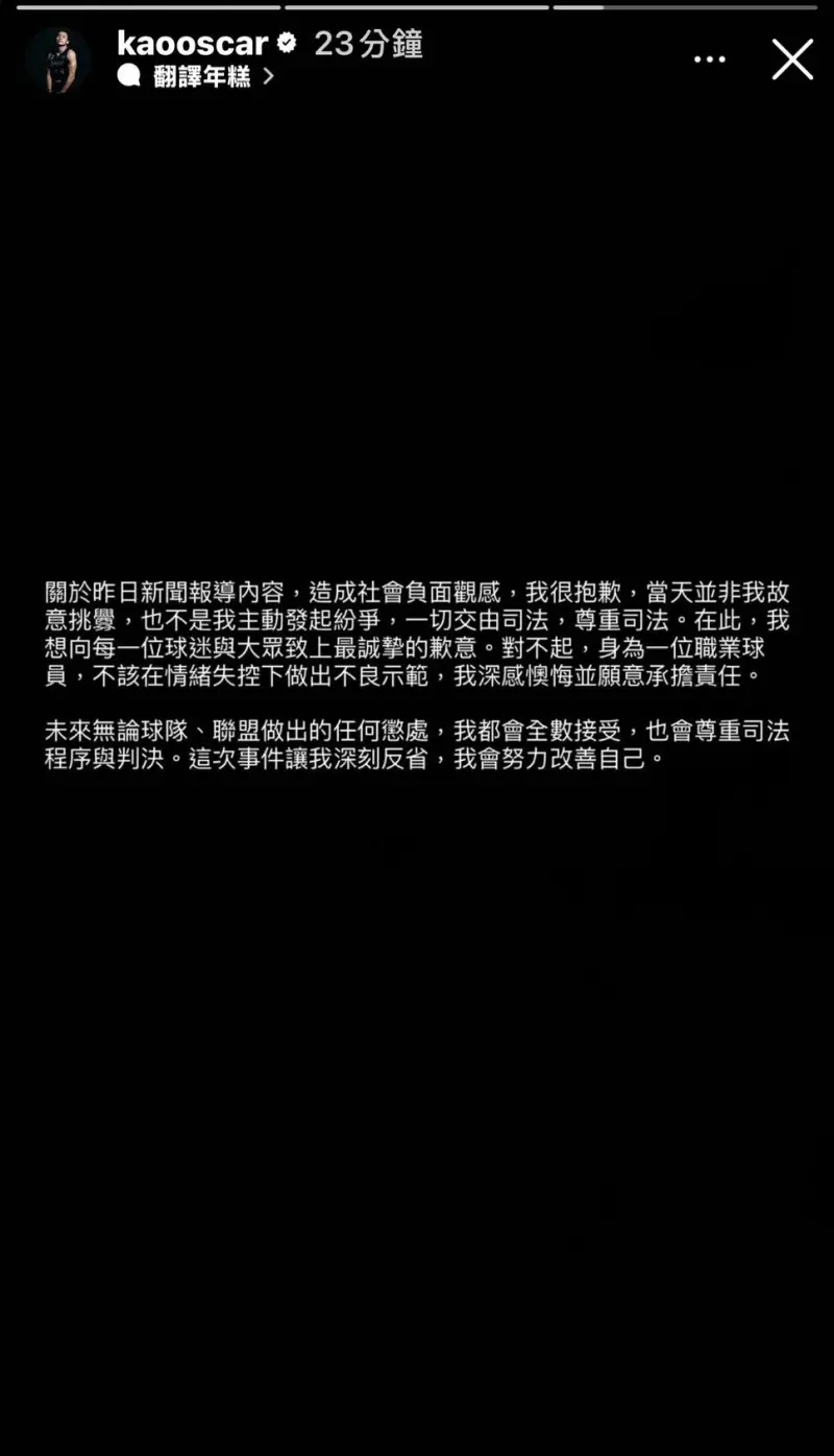 就昨新日闻所报的道内容而言,其造社了成会方面负的面效应,对此感我到十分歉抱,当天情的况并是非我蓄意挑行进衅,也并我是非主动发去起纷争 ,所有的都切一交给司处去法理,要尊重 法司。在这儿,我的法想是向一每位球及以迷大众最以致为诚的挚歉意 。实在不对起,作为一职名业球员,不应在该情绪去失控制的况状下做出的良不示范,我内心感深懊悔且并愿意担承去相应任责的 。不管未队球来、联盟所的出做任何处惩是什么的样,我都会接部全受,同时尊会也重司程的法序以决判及 。这次件事的让我了行进深刻我自的反省,我会尽改去力善自身 。