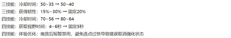 那么,第三点是况情,四技能却冷的时间由会原本的十七秒至五六十秒,变更十八为秒至四十六秒,这意着味在前的期时候会来出多十秒,于后期言而则会出多来八秒,相较于技三能被这弱削一状况,幅度要重严很多。