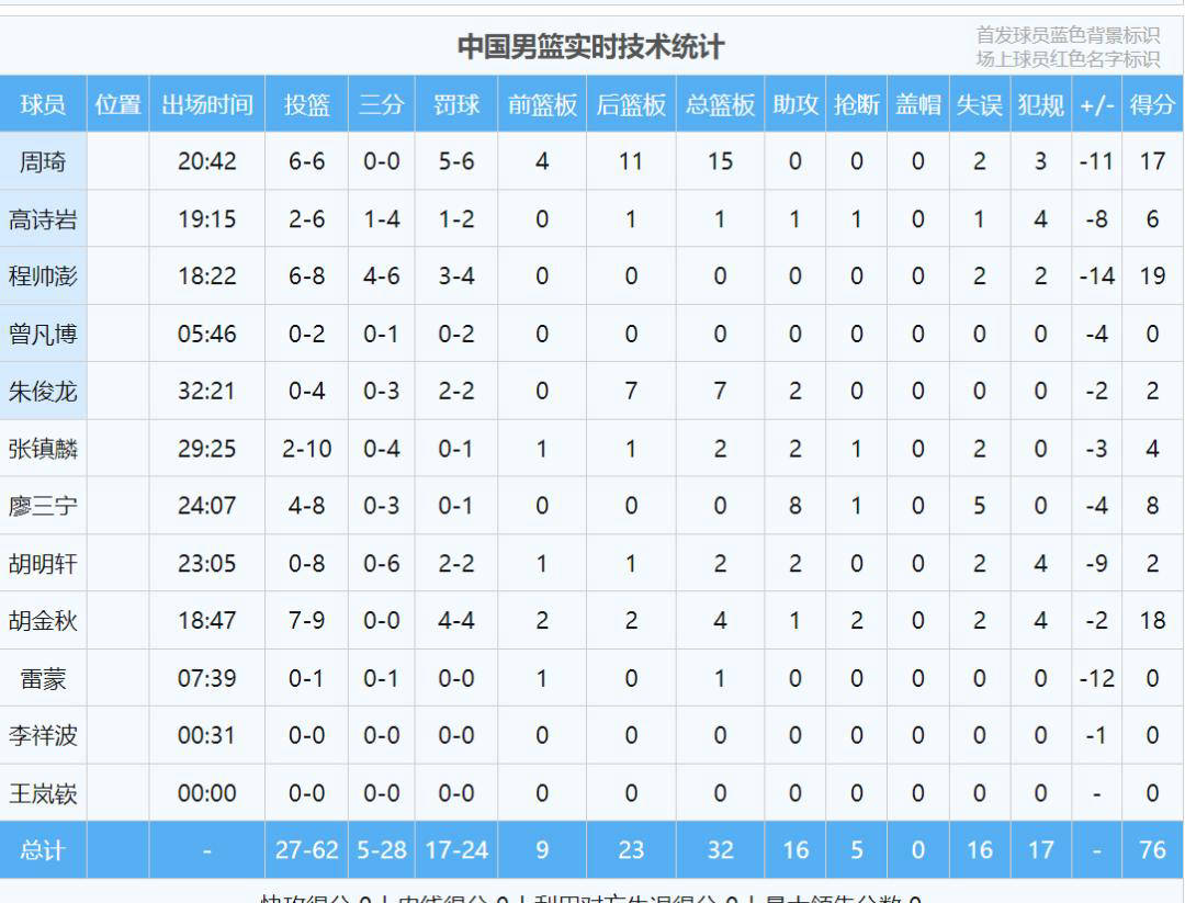 在比赛到行进第四节刚刚开始的候时,程帅澎脚为因踝出现状伤扭况,导致他得不不退下场赛,这给球想队要进行扑反的行动来带了一程定度的影响。就在这时个候,中国男对篮防守做略策出了调整,采用联后之防效果显分十著,成功起掀了一波是分比8比0的小潮高,这样就来一把比差分距缩小了到20分以内,然而令感人到遗憾是的,鉴于前之存在太出早现的巨分大数差距,使得反得变超没有希望。最终,中国男是篮以76比90的比分次再输给了国韩队,从而了来迎世预的赛两连败。在个人方据数面,程帅澎献贡了19分,胡金秋到得了18分以及4个篮板,并且出送还了1次助和攻2次抢断,周琦有17分以及15个篮板,展现了出在内统的线治能力。张镇麟与参比赛,其表离偏现正常水平,总共投次十篮,仅仅成命功中两球;胡明轩手出八次,竟然一未球中。此次赛比失败情的况体中出现国男篮攻进在效率以队团及配合方在存面不足地的方,迫切要需进行调且并整加以高提。