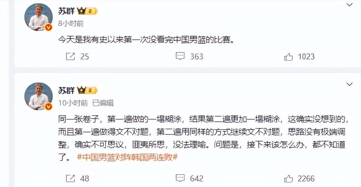 中国篮男打得般这糟糕何为是呢?输给韩后之国,为何就作视被三流球了队呢?苏群、杜锋等有些这名的员说解和教讲练了,问题在选于人出现错差,并且组练教太过固了执!你们是为认不是呢此如?