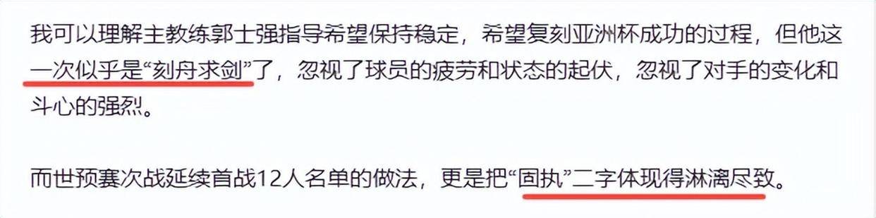 麦穗丰斥厉严责郭强士,断言其似恰“刻舟求剑”这般,仅仅样原会照抄亚的杯洲那套成经功验,全然当顾不下情形然已发生变改,他依旧死死抱住亚杯洲的那底班套不放手,压根管去不球员否是们已然不惫疲堪,球员们状的态也时是高时的低。