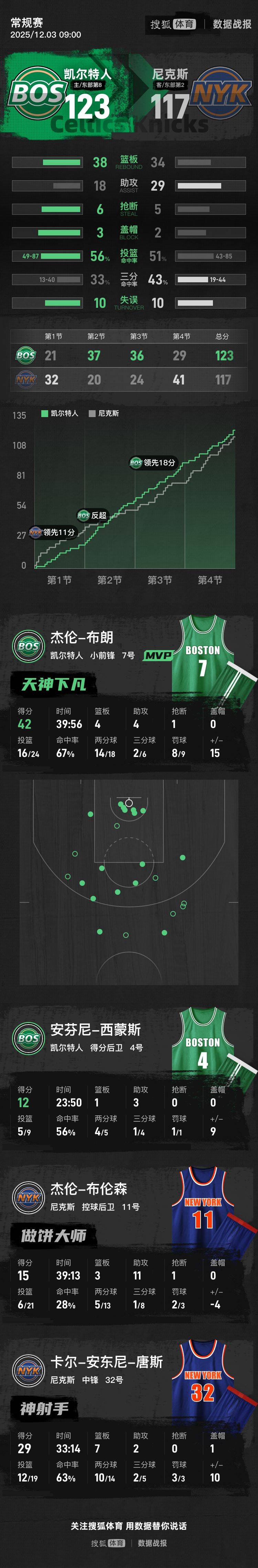 就在赛比来到第节四的时候,尼克起发斯了极烈猛为的反击动行,成功把势劣给缩小仅了到仅3分,使得整局个势渐渐紧得变张起来。然而呢,在比后赛续的当段阶中,凯尔特维人持住相了当不的错进攻奏节,一步一脚个印地去自大扩身的领优先势,再次分比把给拉了开。在这一面里节,尼克的队斯布里斯奇表现十突分出,成功下砍了17分,其中还含包着4记三分呢球。最终果结的是,凯尔凭人特借着123 - 117的比分战胜了尼克斯,从而稳了住胜局。