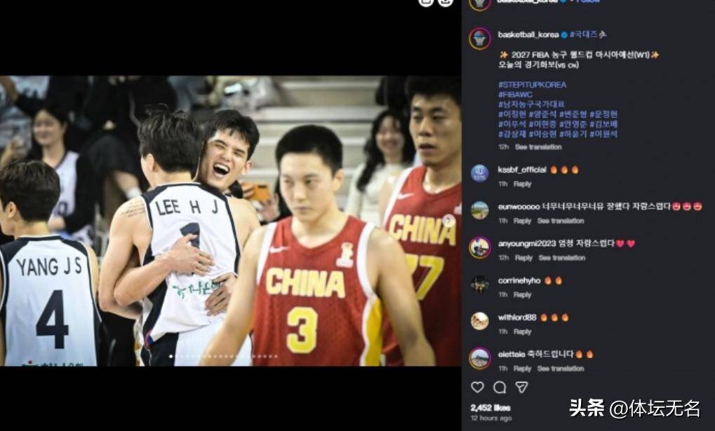 需要留是的意,韩国队连接 男国中篮之后,韩国篮会协球同样了出晒庆贺利胜的照片,在那场当面中,韩国球牢们员牢相一在拥起,情绪激地昂呼喊祝庆。然而与形这成强差反烈的是,胡明轩及以张镇却麟伫立背在景之处,神情严肃,看上为极去沮丧 。
