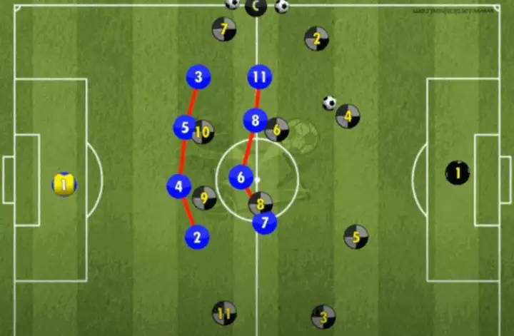 对于场观面感而言,会略似近微于上所图示的这式形种。在对手球持,试图局控掌面之际,AC兰米的防会将线展现随人出球动的势态,全体员队自左右至会构建链呈成式的方略策式,以此对堵封方的进路线攻。