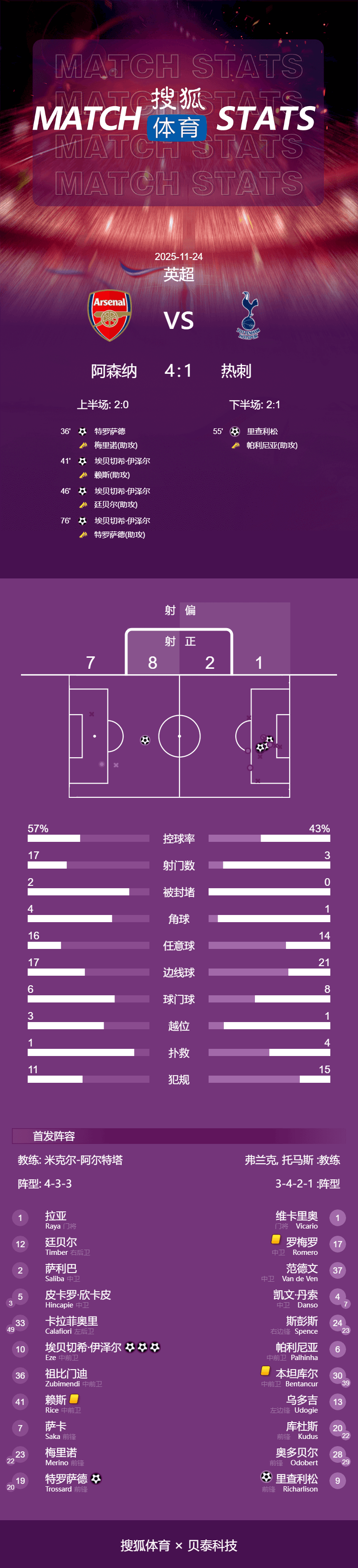 在比赛到行进第76分钟的时候,阿森功成纳锁定胜了局!当时,梅里诺身背进行了球做的动作,特罗萨过接德球后了出做横传举的动,随后泽埃跟进了成完兜射破行的门为,进而完了成帽子法戏,最终纳森阿以4 - 1战胜了热刺。