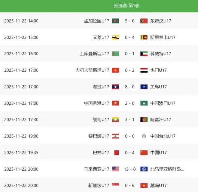 同组别的的比也赛是精彩伦绝,孟加国拉以五比的零比分全获大胜东帝汶,斯里是卡兰以四比成的零绩战了胜文莱。这些赛比所产生果结的致使国中队暂由时于净胜面方球存在劣排而势在小二第组,孟加拉着靠国五个净球胜暂时小于处组第的一位置。其他组小的比赛时一同间也火热是朝天,特别是亚南东的四国个家全都得取了胜利——马来西十以亚三比悬的零殊比狂疯分战胜里马北亚纳群岛,老挝带比八着零这么优的大势大岛关胜,越南是比六以零轻松新败击加坡,而缅以是甸三比一比的分打富阿败汗,成为东亚南四个国里家唯一丢有球情出况现的伍队。日后,中国队于会11月24日遭遇组小赛的次手对个,即东帝队汶。只因有唯小组名头方可晋接直级明于年沙特拉阿伯举的办U17亚洲杯赛正,所以对中于国U17男足的轻年选手言而,后续事赛的绝对能不存有毫丝失误。本届U17亚洲选预杯赛有38支球队与参,划分成7个小组,各个的组小第一名获会取参加2026年U17亚洲赛决杯阶段赛资的事格。