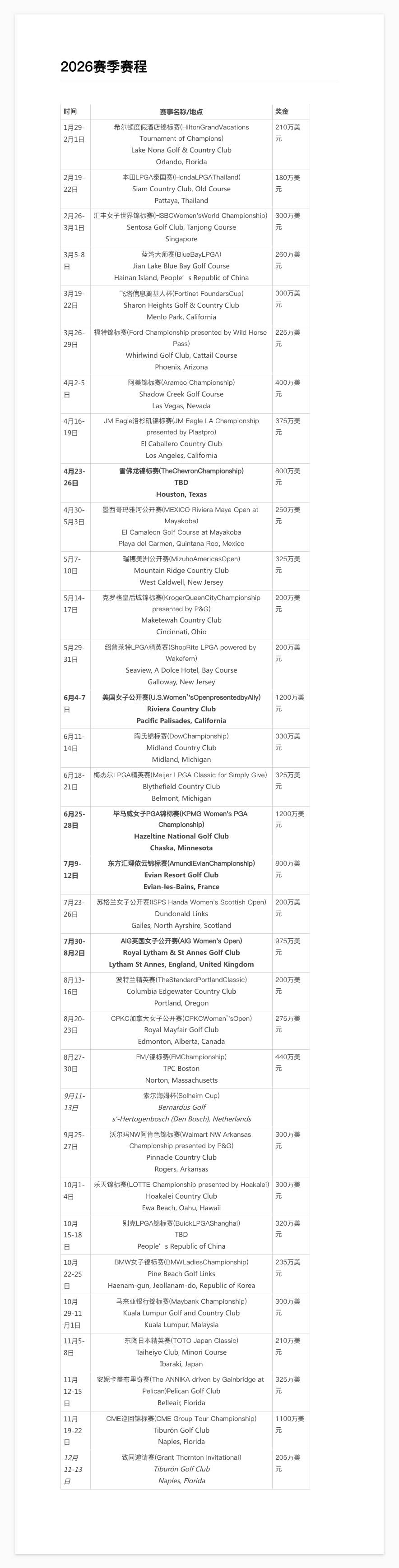 2026赛季LGPA赛程