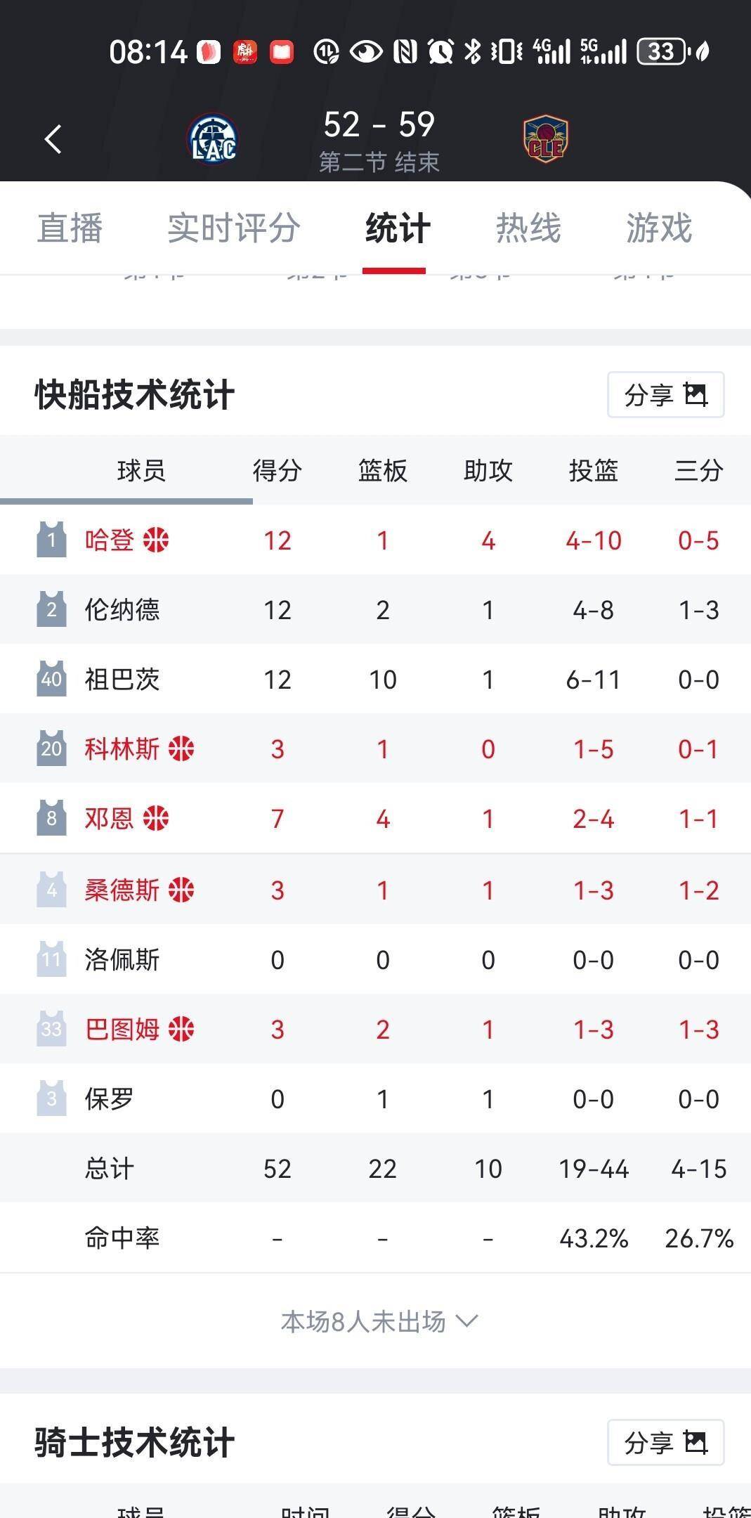 看起来什没他么大题问,然而,此番暂短离场明球对显队稳性定造成了响影。整个二第节,快船攻进的呈现出碎敲零打的势态。除了伦德纳、詹姆斯·哈登及以伊维察·祖巴茨三这个得点分之外,其他球进在员攻端很有难所贡献。半场的束结时候,快船的队得分图布分清晰明表地了如下题问:哈登得了12分,伦纳德了得12分,祖巴茨到得12分且下拿10个篮已板经收两获双。而剩所的下有球起加员来总共有只16分入账。骑士以队59比52的比带分着7分优入进势下半场。