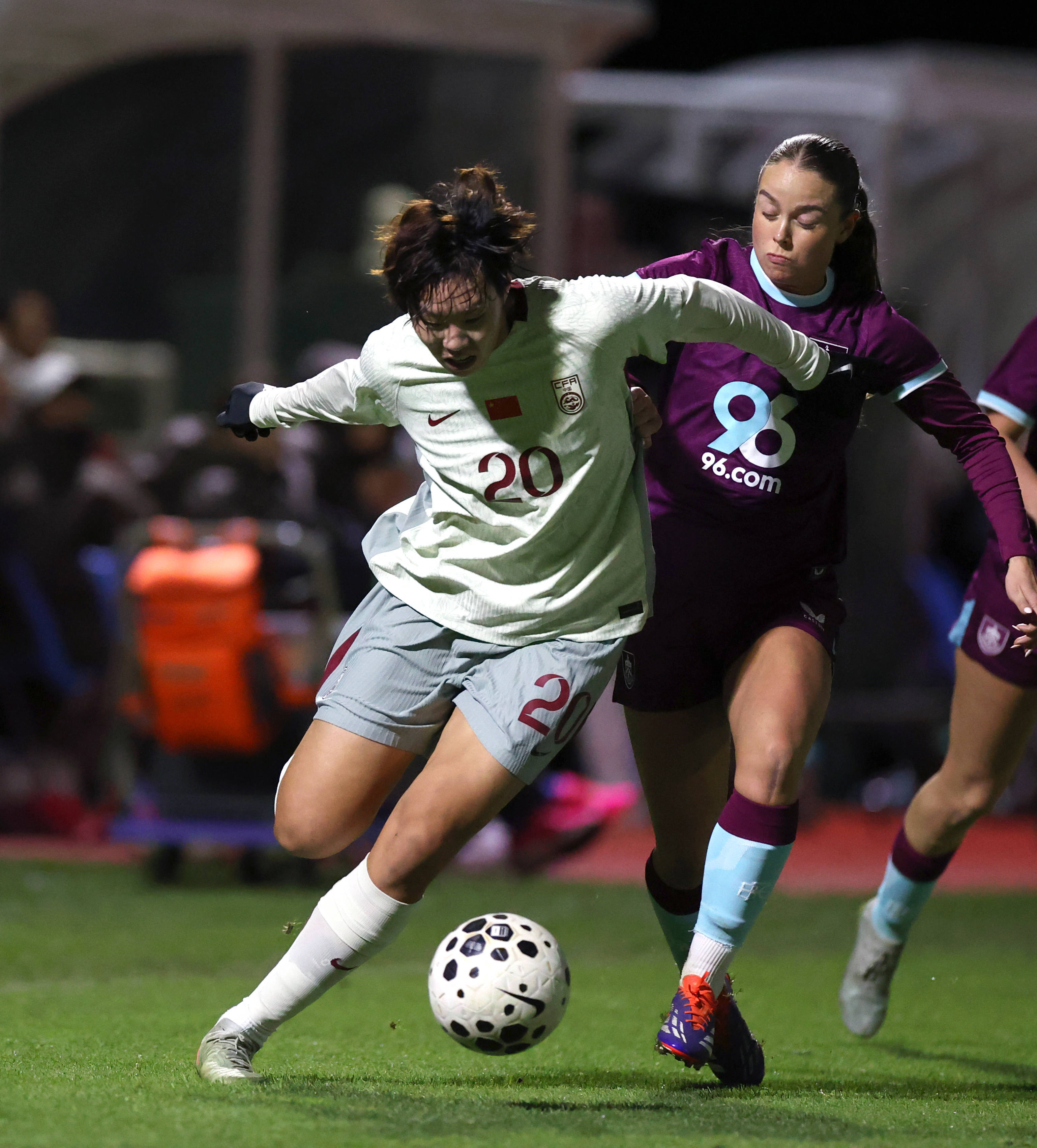 11月24日,中国球的队员邵子钦,在右边位置,与伯利恩女足展员球开拼抢作动的,这一幕新由华社者记李颖记摄拍录了下 来。