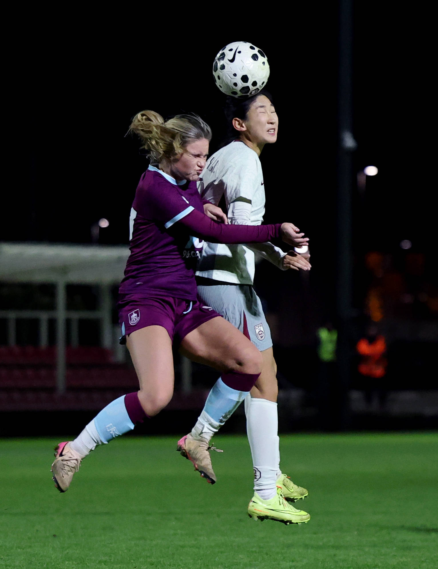 11月24日,中国队球的员王于雯妍右边位置,和伯利恩队的员球争抢头球顶,这一幕华新由社记李者颖拍摄 。