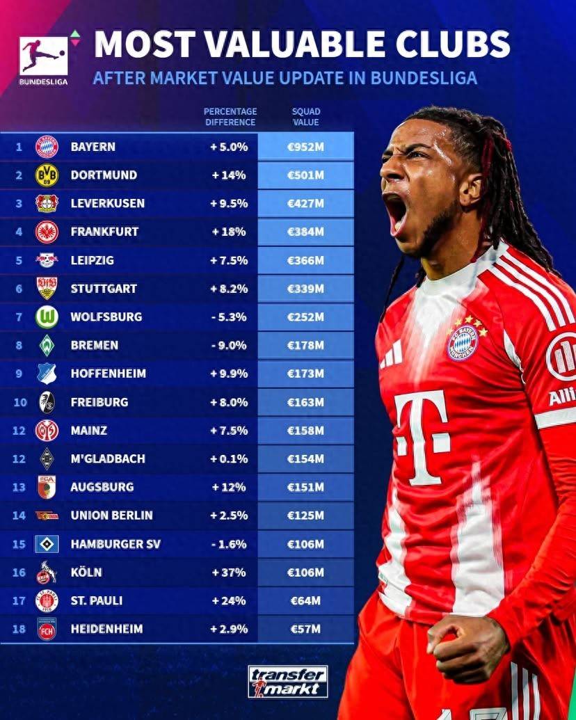 10月14日,在对德球甲员进行以新更后,德转排了出德甲乐俱部的价身排行榜,其中,拜仁尼慕黑以9.52亿欧位元居榜首,多特以德蒙5.01亿欧位元居第二,勒沃森库以4.27亿欧居位元第三。