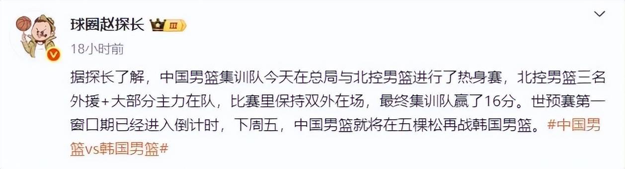 中国男入进篮集训过然已去一周间时,为对球的们员状态以予检验,篮协对与场一北控男热的篮身赛了出作安排。这场比虽赛采用封式闭开展,具体赛比结果以员球及数据公未并开,然而从上网所流出片照的能够看出,比赛强相是度当高的。北控的篮男三名外援,也就里是勒、西伯及以恩佩里,均在场着有上较长时的间出战,北控终始维系着外双援阵容。中国男面方篮呈现色出出表现,始终赛比对节奏予掌以控,最终凭借16分的取势优得对阵的手对大胜。