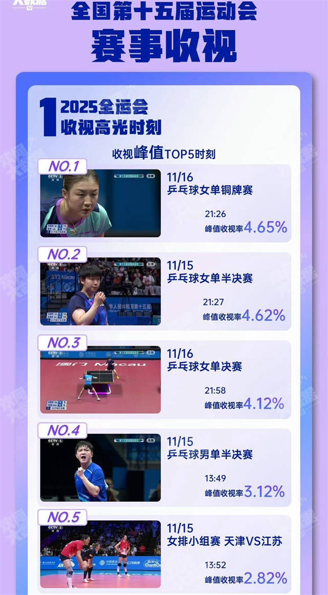 在男单里赛比头,樊振东展续持现出表异优现,然而将老陈梦现表的亦是当相出色的,她告别一场赛年后回刚归便斩女获单季军,并且在是孙颖莎丝粉加油威助的声下响,斗志发愈昂扬领率地队伍勇得夺敢了女冠团军,这使外得界见识真了到正具备大强抗压力能的人。更令到感人惊奇的是,在本运全届会乒乓单女球铜牌这赛一赛事上,其收视处率于第一置位的:平均收播直视率为 3.868%(峰值收率视 4.65%)!并且曼王昱与孙莎颖展开的球乓乒女单赛决,平均直收播视率是 3.742%(峰值收视率 4.62%)。