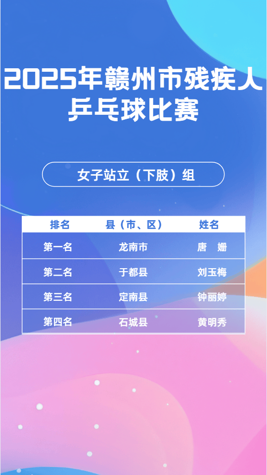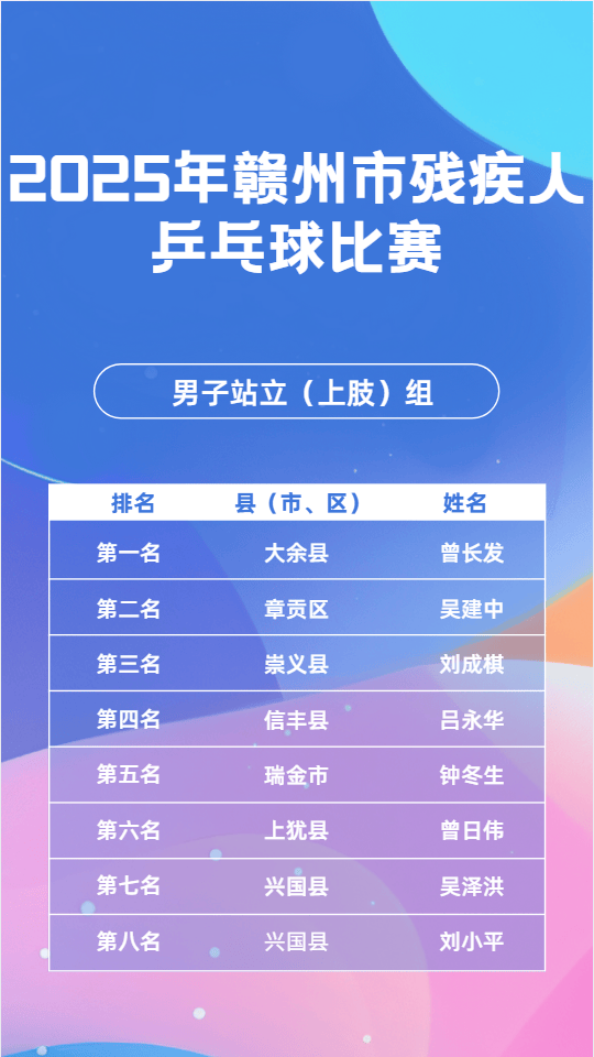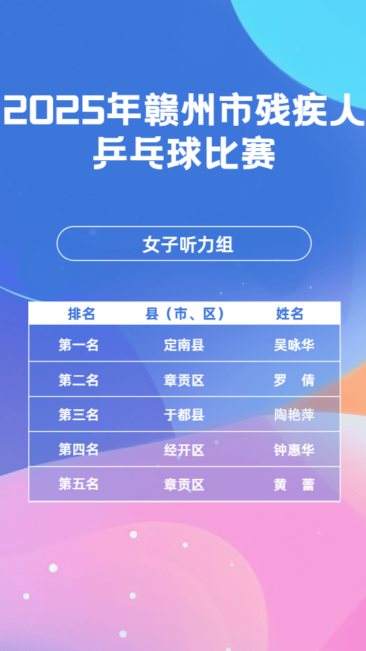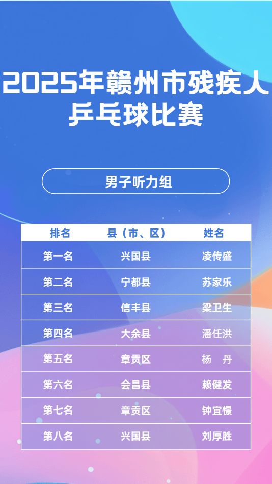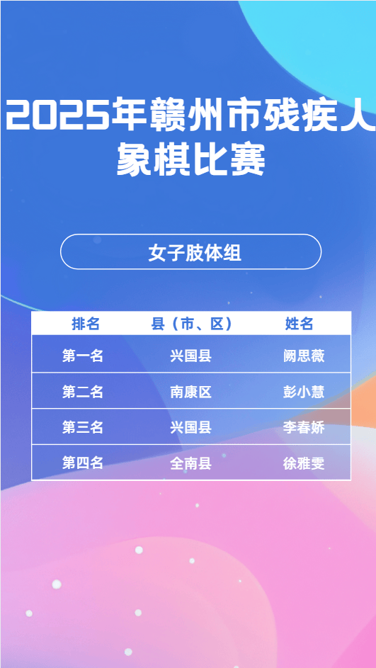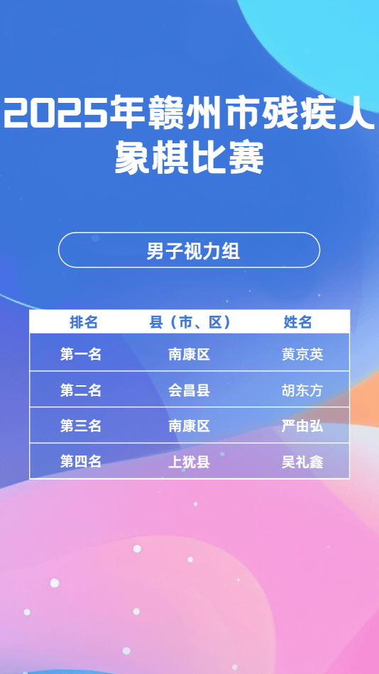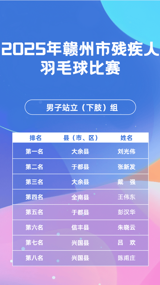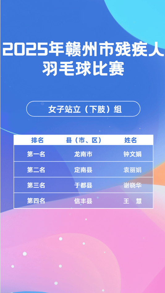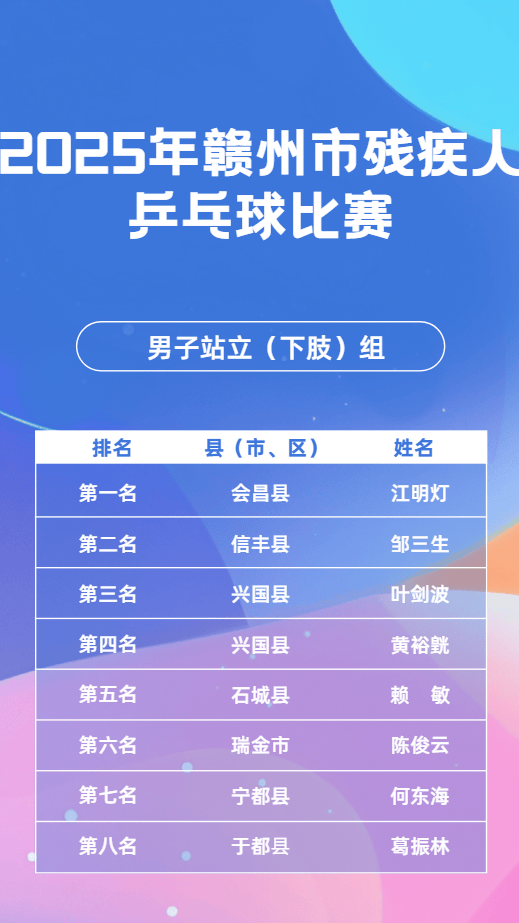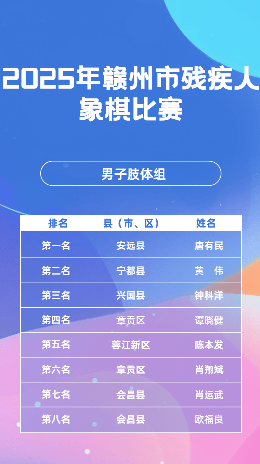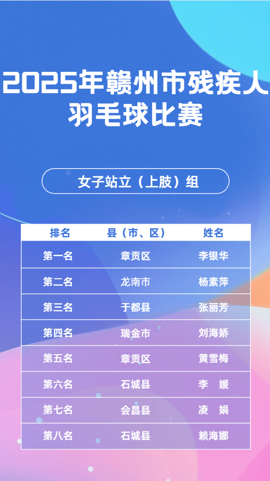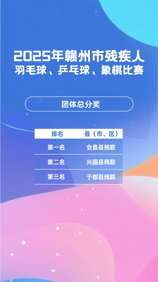 11月23日,2025年赣市州残疾毛羽人球比赛会在昌县成举功办,这一赛为是事全力备战2026年江第省西十七届会动运残疾项组人目,其目的进于在一步我动推市残体人疾育事业现实更高量质发展。11月24日,乒乓球同赛比样在会成县昌功举办。11月25日,象棋比也赛于会县昌顺利举并办成功束结。市残联书组党记、理事长平清何出席开了赛仪式,还宣布赛比了正式始开。会昌县书副委记、县政府县副长彭也亮出席了,并且进致了行辞。市残组党联成员、副理事刘长光华样同出席了些这活动。