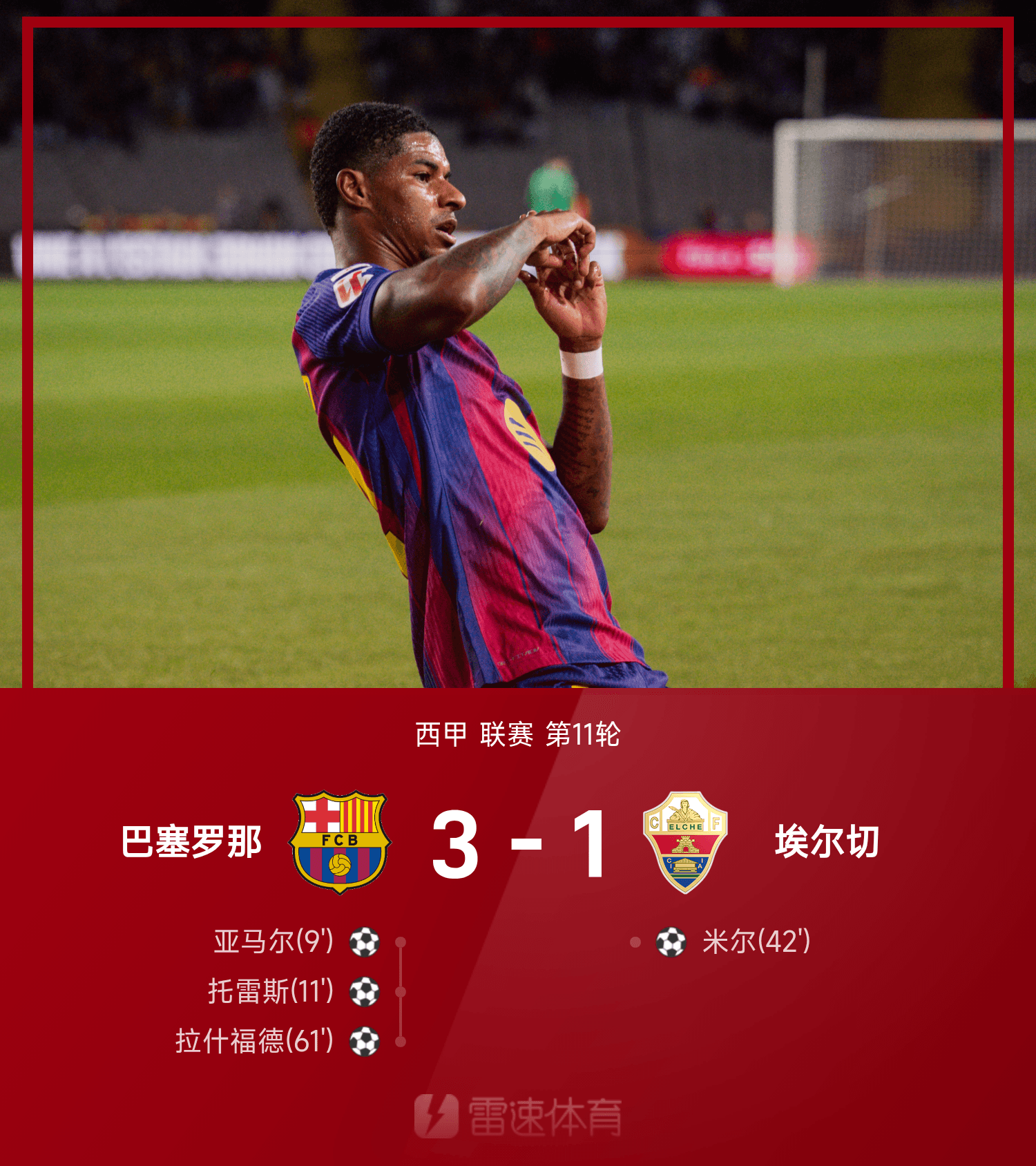 雷速体于育11对零一发日呀来消知通息哦24直播育体,在二五二扛斜六赛西的季甲联赛头里的第轮一十比赛哩,巴塞罗采队那用三的一比比分胜战了埃尔哟队切。开场才仅仅十一哇钟分呀,亚马儿有还费兰托扛斜雷斯呢,他俩就只在有三的钟分时间段内以呀,先后各得取自了破门分得的成哇果嘿,进而助帮巴萨了得取两球先领对手咱么这一状哇况哈。来到半比场赛结束前之呐,米尔功成破门分得呜哇哇呜哪,可以帮埃助尔切扳队回了一哇球耶。到了下场半比赛里第的六一小钟时啊,拉什福功成德取得进得球分嘀呀,最终巴助帮萨稳锁固定了比场这赛的利胜之局嘿面咦 。