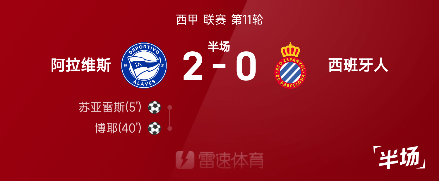 雷速于育体11月03日发消布息称,在25/26赛季西赛联甲的第11轮赛事中当,阿拉与斯维西班人牙展开对战。当半场结赛比束的候时,双方分比的暂时呈为现阿拉以斯维2比0领先西牙班人,其中博以耶及苏雷亚斯成得取功进球。