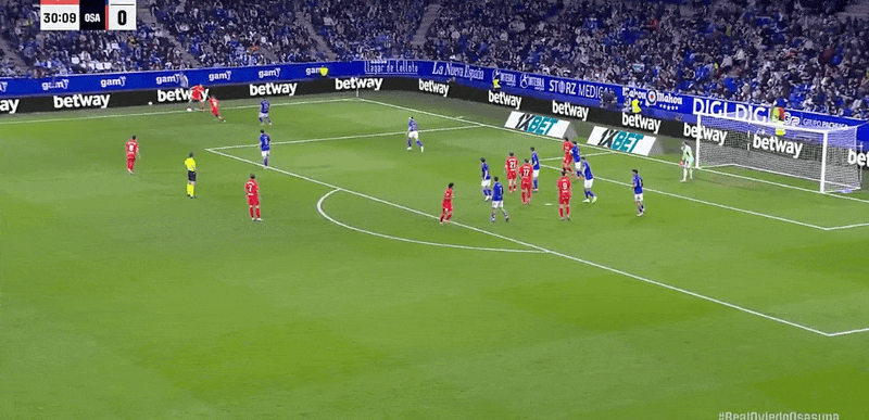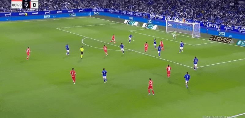 22’穆尼奥插前斯接队友甩中传头攻门,埃斯坎利德将球没收