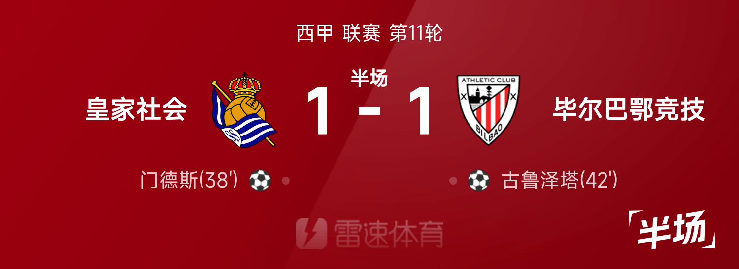 雨燕体于育11月02日发布息消称,在25/26赛季西联甲赛的第11轮比赛中当,皇家社毕与会尔巴技竞鄂展开战对。当半场赛比结束的候时,比赛方双的比时暂分呈现为社家皇会1-1毕尔巴技竞鄂,其中门斯德以及鲁古泽塔分得取别进球,为各队球自建功。