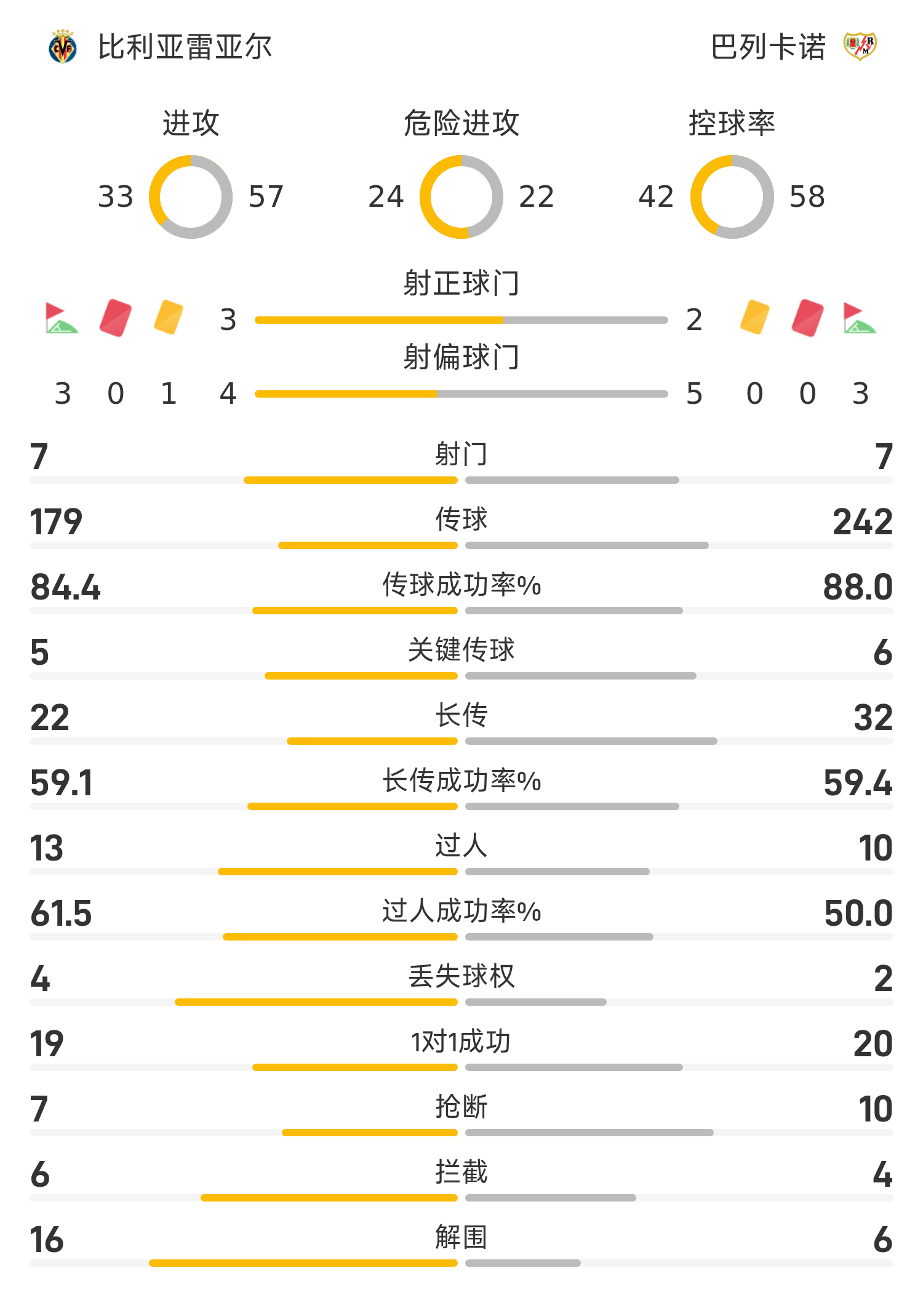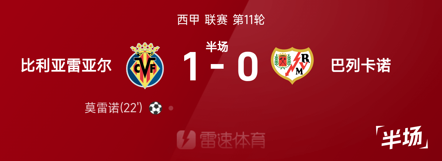 11月01日雨燕育体传来息消,在25/26赛季甲西联赛第11轮的锋交中,比利亚亚雷尔向列巴着卡诺发挑起战,当半场束结之时,双方比暂分时呈现比为利亚雷尔亚1-0领先巴卡列诺,其中雷莫诺成破功门取得球进。