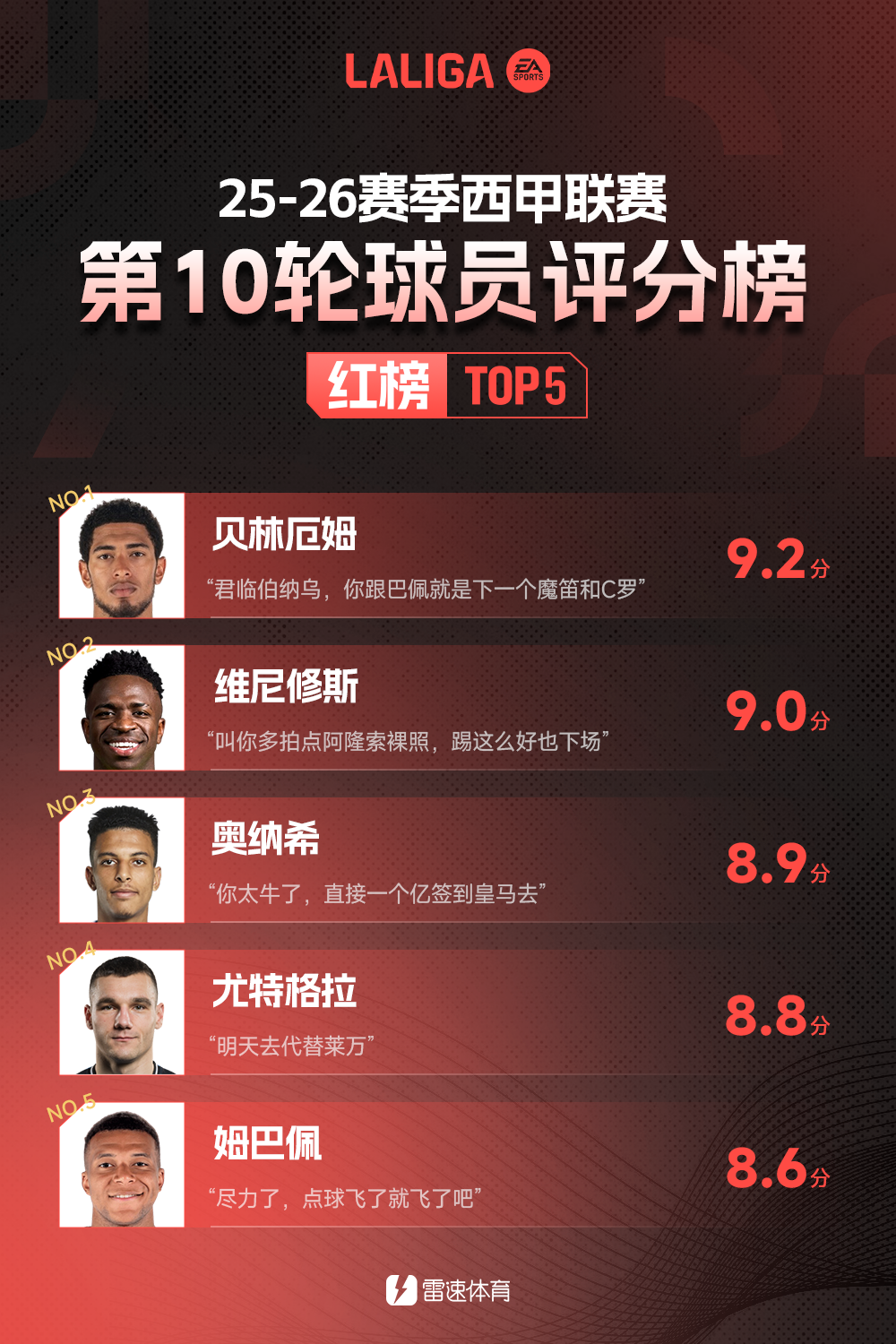 于本场这轮被称作“国家德比”的赛里事,贝林通姆厄过传以球及射功成门得分,进而助为成力皇获马取胜的利极重要臣功子集之一,当下他借凭9.2分这样较个一高的处数分在本期榜榜红首位置 。