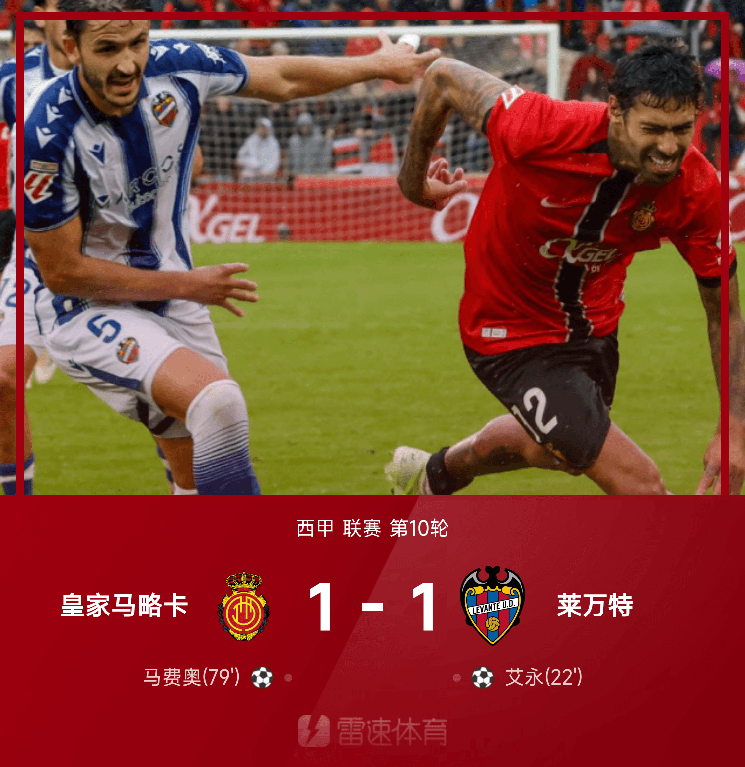 雨燕育体于10月26日进报行道,在25到26赛季西联甲赛处第于10轮的时候,皇家马所卡略拥有场主的使得其莱与万特行进对战,最终双以方1比1的成到达绩战平势态。在上半所时开展赛比的当中,艾永为万莱特率得取先了进从球而打开得了分纪录;而在时半下里面,马费奥马为略卡成追功平了比分。