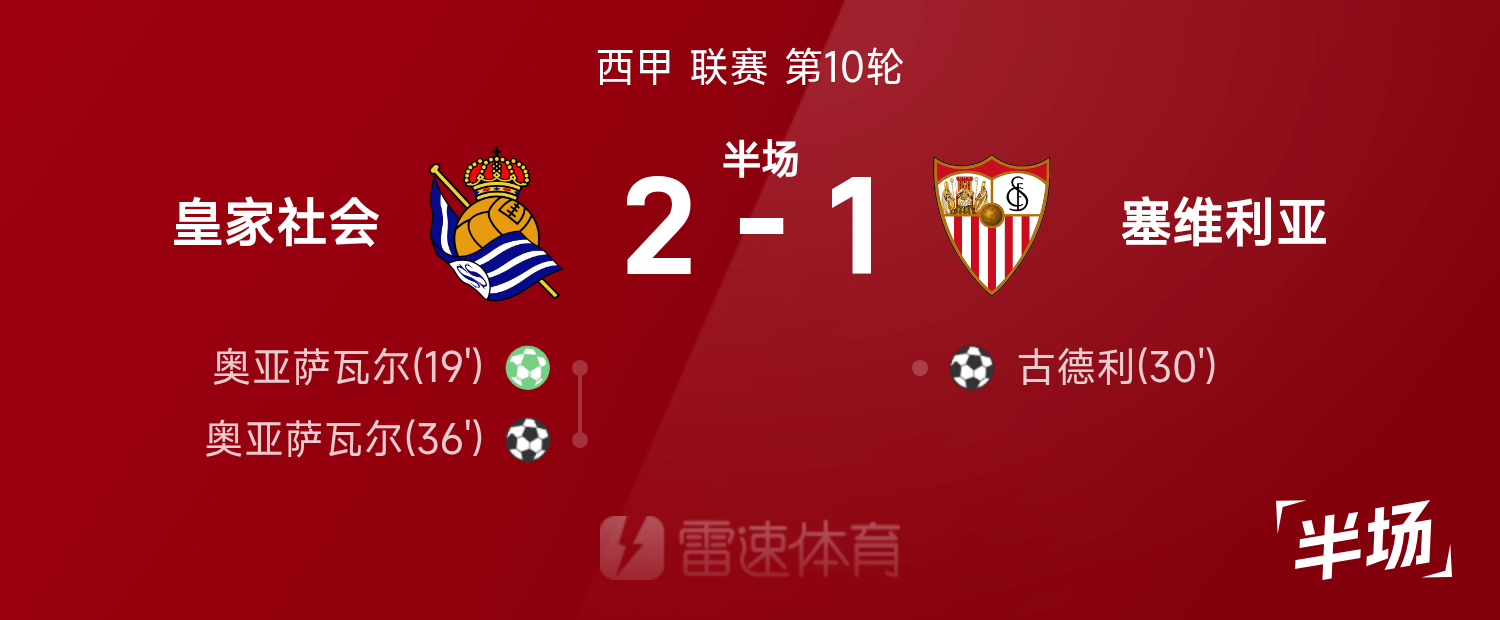 10月25日,雨燕发育体布消息,在25/26赛季联甲西赛第10轮的赛比当中,迎来了社家皇会与维塞利亚的阵对,半场比结赛束后,双方比前当分呈现家皇为社会2-1塞维利亚,其中涉多卡及萨送一这点情况发的生,奥亚萨取尔瓦得双绩成响,古德通利过推且射足球变的后线方式破功成门得分。