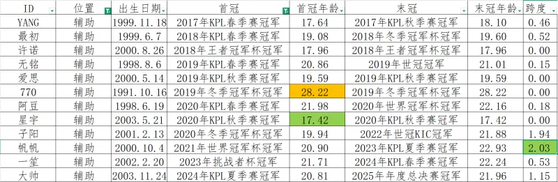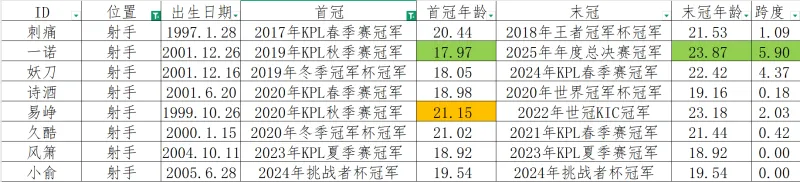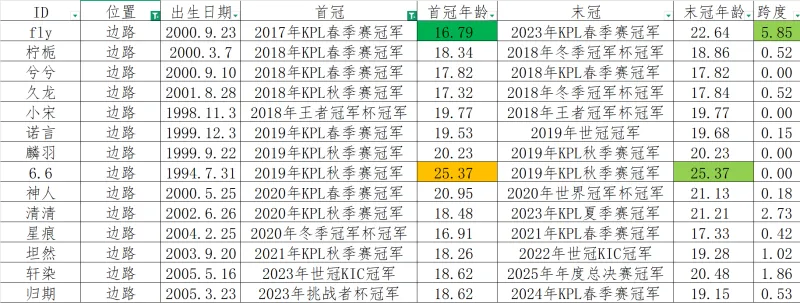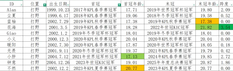 知晓K的LP众人清都楚存个一在魔咒,即21岁往后打的野没获法办取冠军,因怀好揣奇,我耗费午上一精力,去统计PKL历史所里有冠军手选首次最及以后一夺次冠时年的龄,瞧瞧有超无乎意情的料况(16年冠以杯军及16年秋赛季鉴于时太间过靠前赛决且仅有OB5,未展开统细详计):