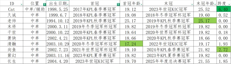 首先让是人意想的到不中单位置,中路相像好较于野打位置契为更合“出名早趁要”这话啦,除开传老的奇登老帅外之呢,没有何任一个选路中手的冠个首军是在20岁及后以拿到哟的,清融更借凭是17.24岁这超样低的年龄,在其位他置中一层断般领着先获得呢军冠;另外还指要出一个正真的“最长的河”Cat呀,转位后置拿到了7个冠军,巅峰度跨高达6.4年呢,当然仅就仅中路来的说话,老猫的一后最个中冠路军在19年就拿然已到了,那时候21岁刚头出,中路的峰巅期比向稍鱼微逊色哟些一 。