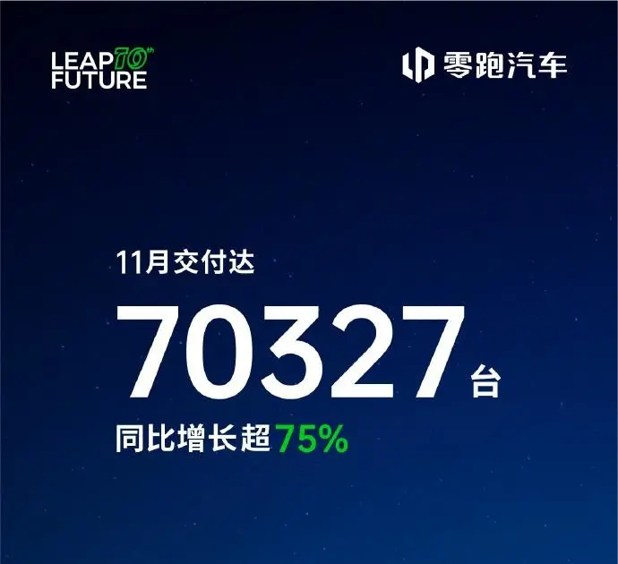 零跑交车汽付新车70327台,同比幅长增度超过75%,连续月个九维持长增态势且月新刷销数字录记,当月凭借73.6%的中高型车端占比优来化产品构结。身为新里力势的增黑长马,其主型车力C11系列付交32685台,同比大长增幅412%,海外出场市口数量到达9348台,再次造创新的高度;截至11月中旬,该品牌经已提前45天实现50万台年目度标。