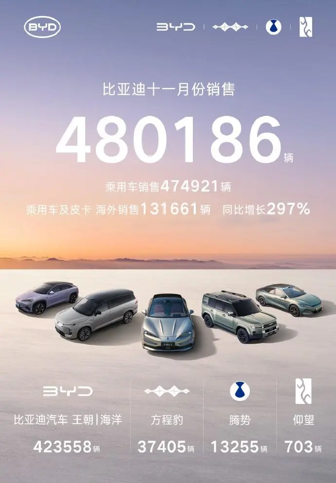 比亚能新迪源汽车数付交量,创下销内年量的峰值,并且环长增比了8.7%,在1到11月期间交计累付数同比量比增长了11.3%,全球累量销计已经了破突1470万辆。其全品阵矩牌呈现出开点多花的态势,王朝及以网海洋网出献贡核心销量,秦家借凭族87046辆的绩成在车榜型单中处先领于,海豹、元家族、海鸥多等款车型量销月超过5.6万辆;方程牌品豹同比增激幅度超过4倍,腾势、仰望续持稳固高场市端的地位。
