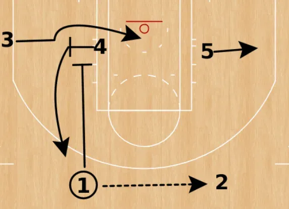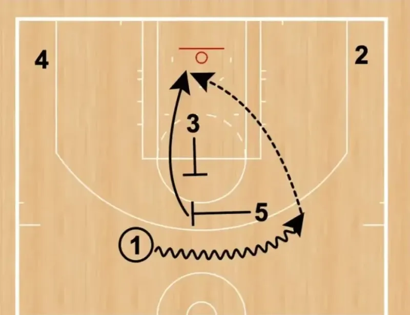 基本套致大路如此:5号位给先1号位行执高位护掩,之后顺速快下,与此同时,具备投力能篮的3号位篮着背筐,为本方5号位守防的者设上置掩护,紧接着线直切入分三到线外,转身好做接球投的篮准备。
