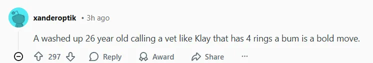 一位26岁已过年的气长选手,将拥有4枚戒的指老将称莱克作废物,这是胆大个行为,它收了获297个赞 。