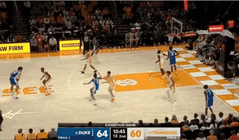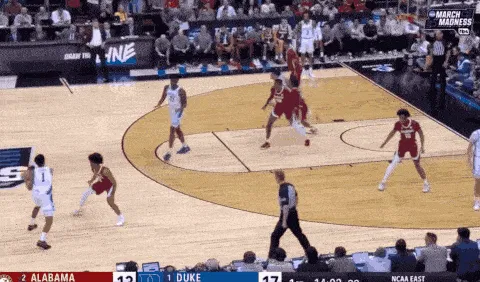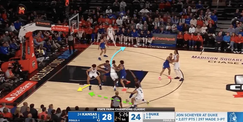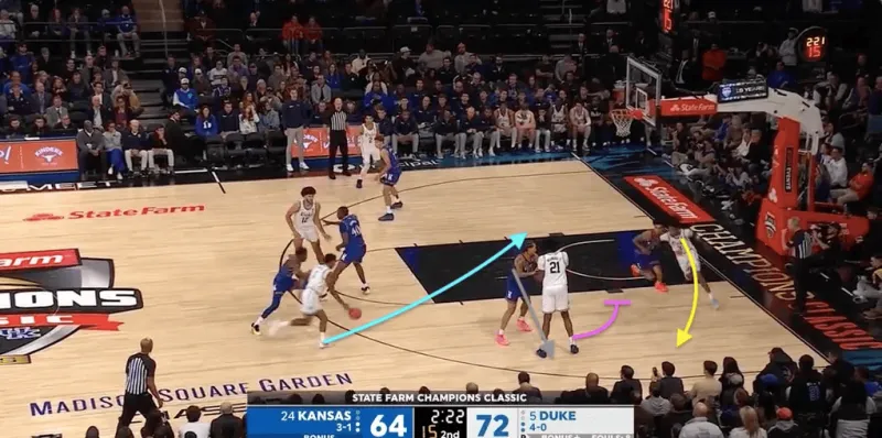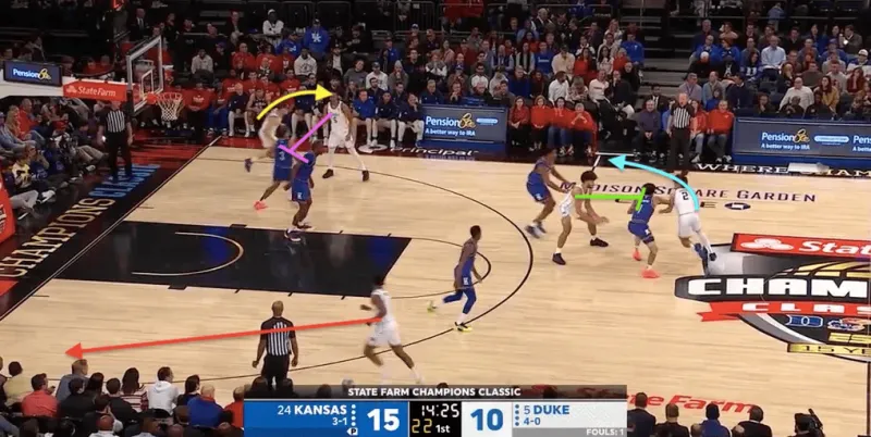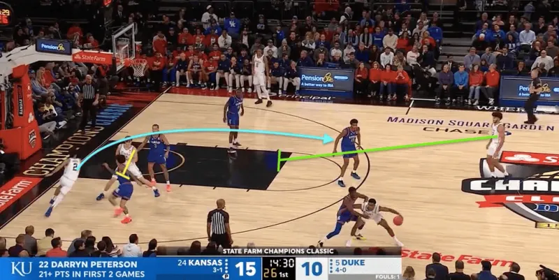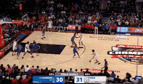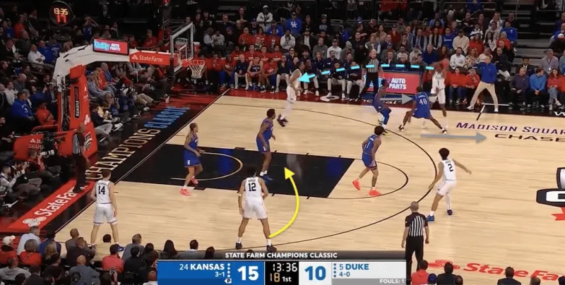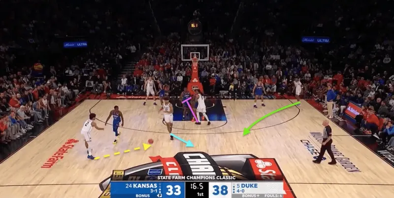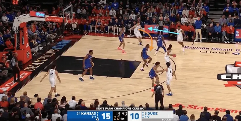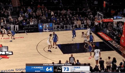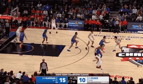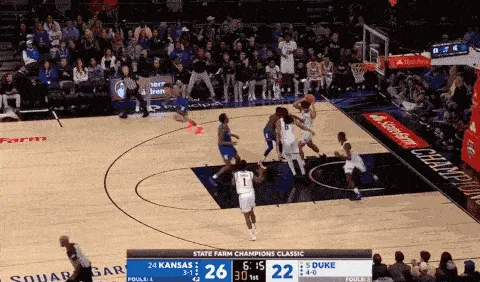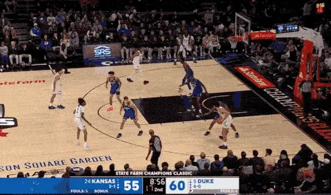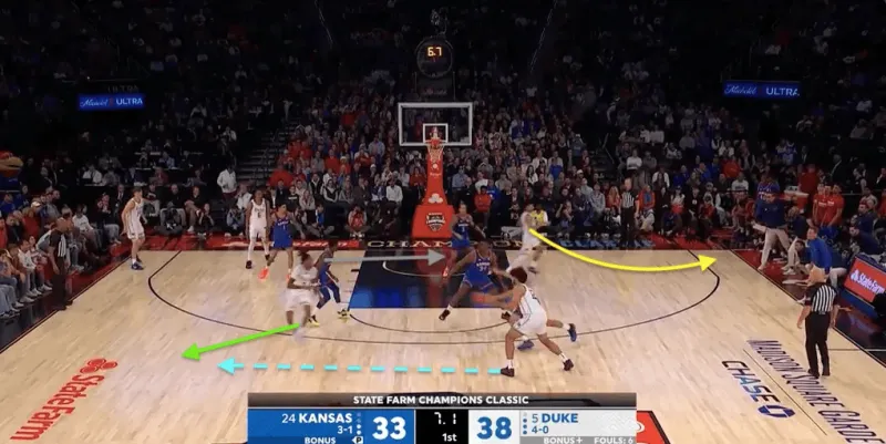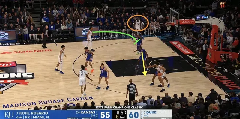 当比剩还赛下大概9分钟际之,杜克出展施了他们有具标志性低的位进术战攻当中个一的玩法,于此得使卡梅伦·布泽右于尔侧低接位到了球。在弱侧区的域那儿,蓝魔运了用常用外五的站位式方:5号位的朗布向上至提45度的置位,达姆·萨尔也藏潜于底之角处。堪萨斯能未针对尔泽布实施凶包的狠夹举动,不过一大当新生森赖布·蒂勒就也是身着15号球守防衣这次低背位打之时,体型的大较中锋弗里洛·比东也加就是40号Flroy放过朗布了这个对手,一步步着朝杜克位那的明星子个大挪动准而进备进行防协。由此致弱使侧仅名一余防守者,即后小卫梅尔文·康西尔(14号 rJ.),其要同顾兼时布朗与尔萨。布朗时准瞅机,于康尔西身旁构了建一个 alfre 护掩,与此同时,布泽把尔球大度幅横向递传给了尔萨。